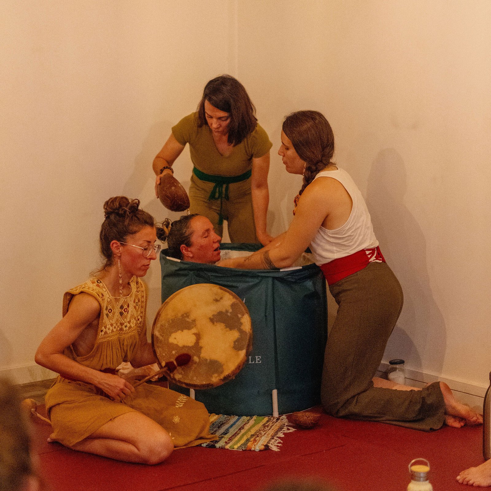 - Un Baño caliente con 10-12 plantas medicinales acompañado de tambor y cantos. El calor que acompaña el agua es clave para eliminar toxinas, soltar emociones y apegos. Es un momento muy íntimo para adentrarse en la cueva, en la matriz, representa el temazcal…rendirse, soltar, purificarse y renacer.